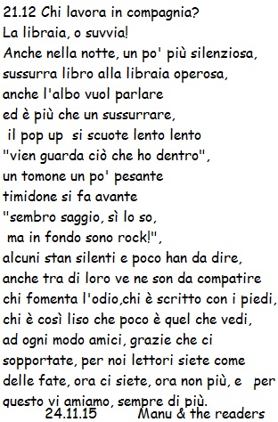 *Per chi si chiede come proporre libri che non si possono vendere! e credete molto spesso ci viene chiesto o chi va in biblioteca ci confessa di andarci sotto voce quasi come fosse una mancanza di rispetto verso di noi, assolutamente no! Anzi, le librerie vicine alle biblioteche hanno, per lo più, una vita più allegra perchè si crea un ambiente maggiormente incline alla cultura e volenteroso di sapere, comprendere, conoscere, insomma né la libreria né la biblioteca sono più sole ma si crea un ambiente “caldo” in cui seminare e coltivare il proprio lavoro, non si è più “vox clamantis in deserto” ma vox viva e produttiva!