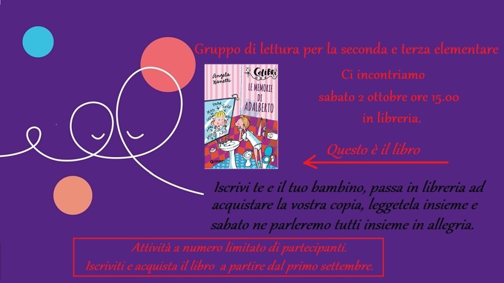 Questa attività si affianca all’ormai decennale book club per adulti e mira a far scoprire e/o riscoprire il piacere di leggere insieme mettendo al centro i piccoli lettori, troppo spesso infatti la lettura viene rivestita di un puro fine didattico “leggo questo libro perchè a scuola faccio questo argomento” ma la lettura è ANCHE questo NON SOLO questo e noi vorremmo riscoprire insieme a voi un piacere.