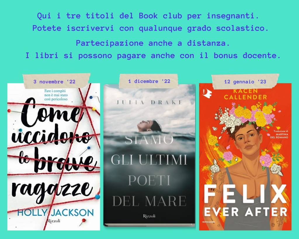 Il gruppo di lettura insegnanti è aperto a docenti di ogni ordine e grado e i libri scelti sono un modo per conoscerle meglio i ragazzi e avvicinarli con una sensibilità affinata sul loro modo attraverso le letture. Se siete insegnanti o ne conoscete di interessati venite e provate o avvisate i vostri amici insegnati di questa iniziativa e noi spiegheremo loro tutto!